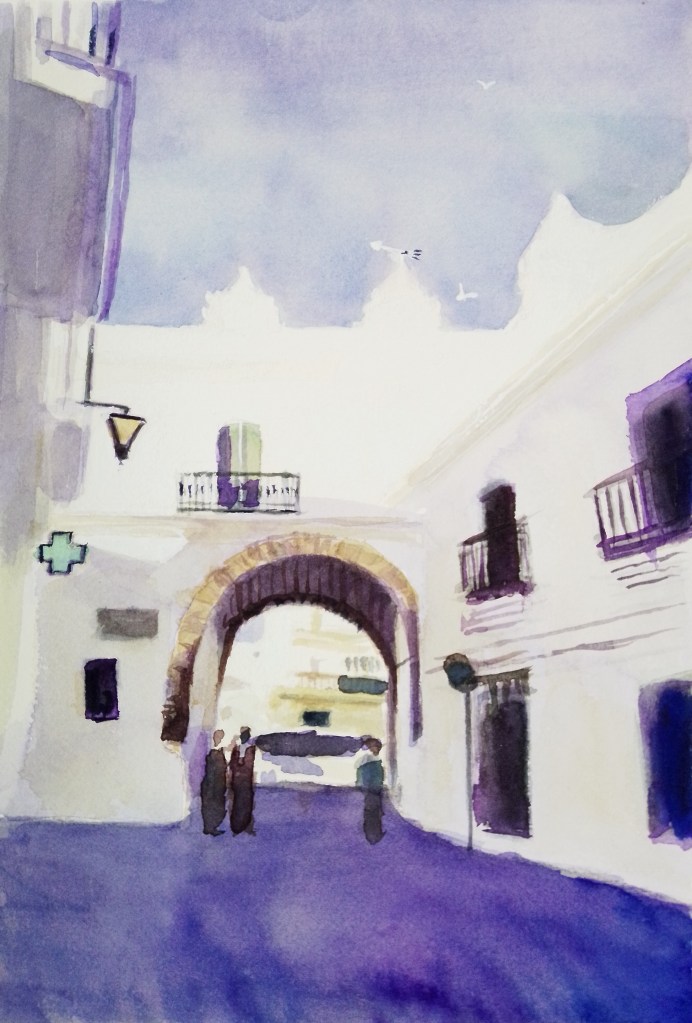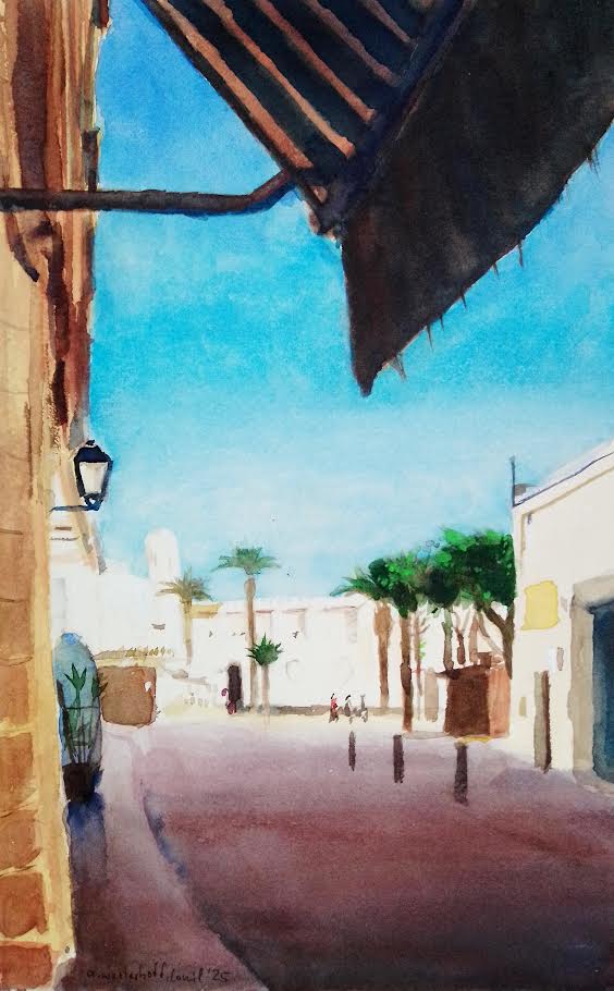 Vista desde la Calle Cadiz hacia la Plaza Santa Catalina. Acuarela, tamaño A4. View towards the Plaza Santa Catalina. 18 cm x 28 cm,Watercolour, size A4